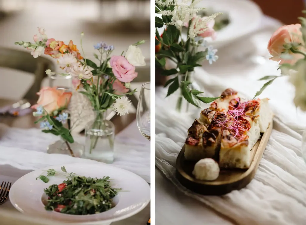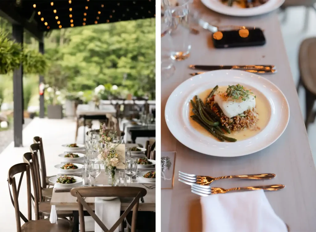 A short walk or ride down the hill leads to our clean-lined garden terrace, where your guests can take their seats as a delicious, fully customized dinner is about to be served.