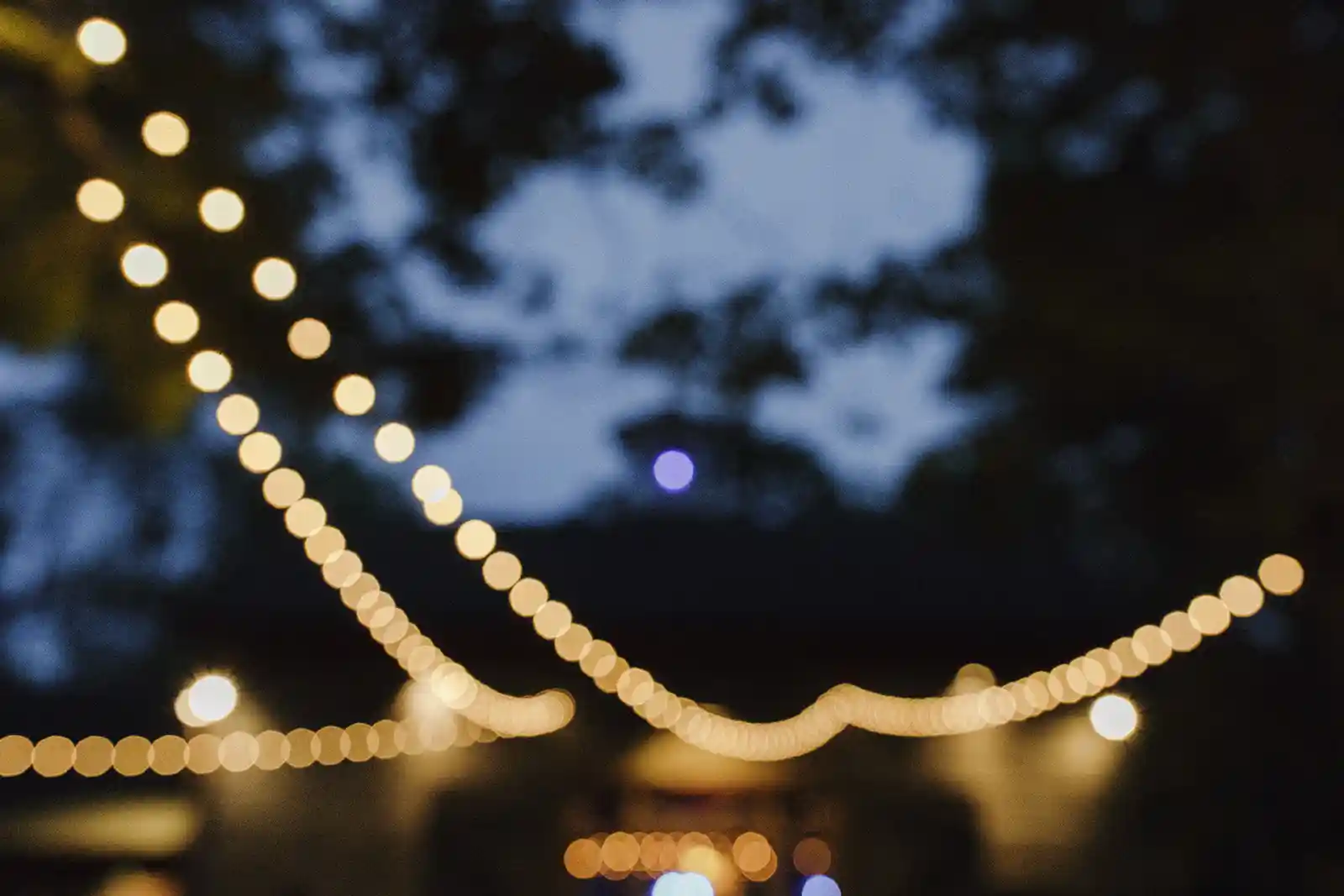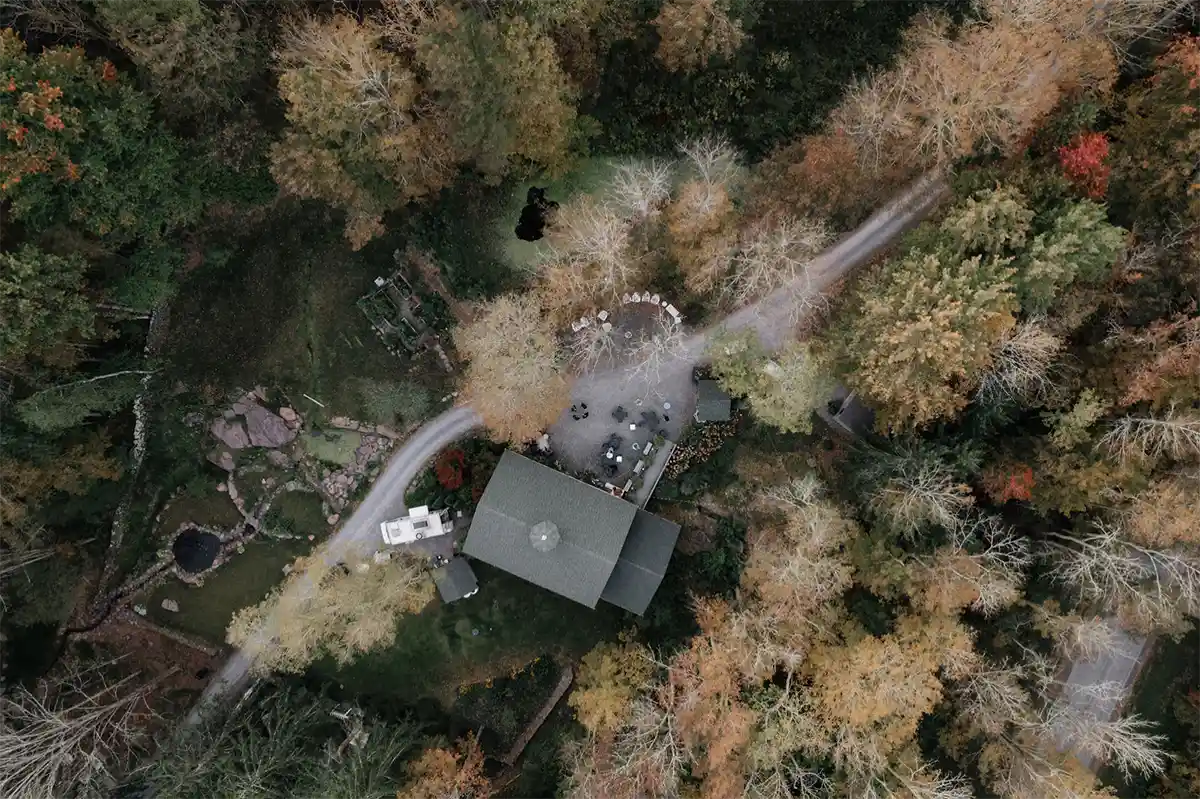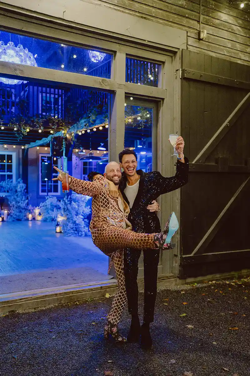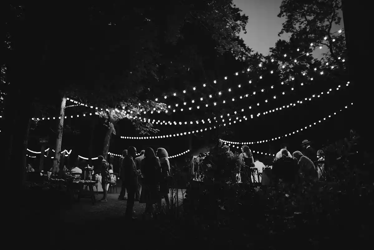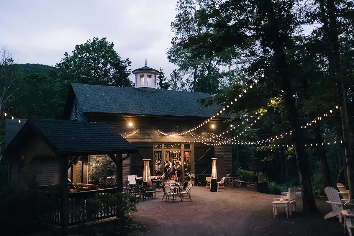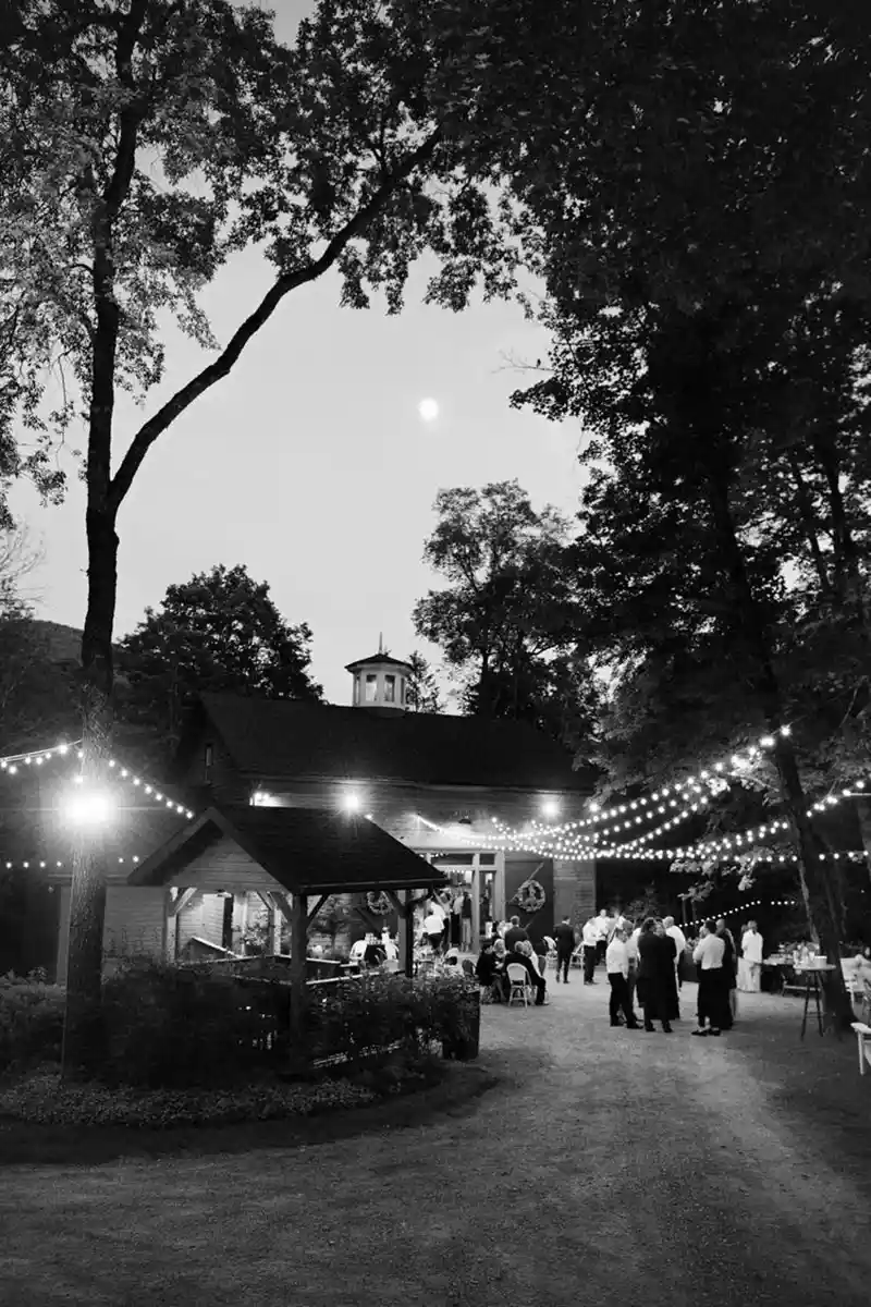 Two-story barn for dancing and late-night gathering. Main floor for dancing, upstairs lounge for conversation, tree-lined courtyard outside.